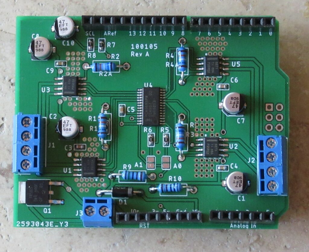 Originally developed for prototyping the shade screen controller this chopper drive Arduino Uno Shield provides up to 2 amps current controlled power to any dual winding step motor. Voltage rating is 12 VDC. Two separate drives are contained on each shield and each shield may be programmed for up to 4 different I2C addresses allowing up to 8 step motors to be controlled.
