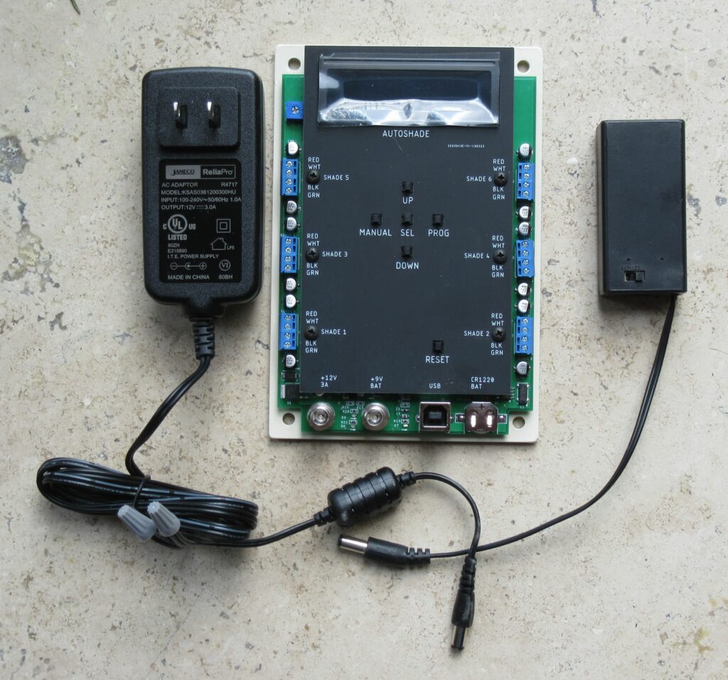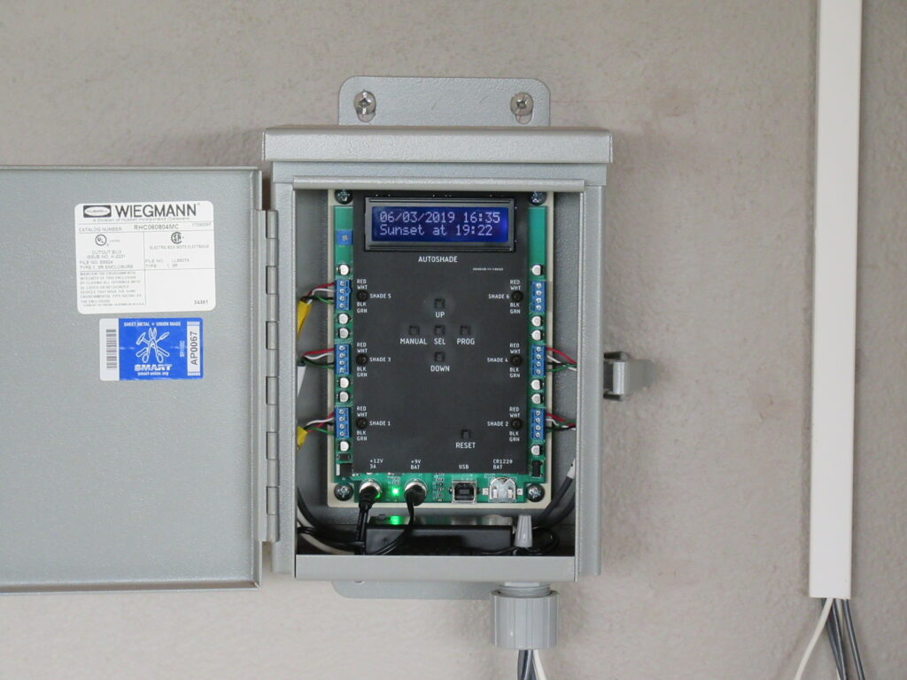 Manual or automatic control of up to 6 shade screens using motor conversion kits. Calculates time to lower and raise shades based on sun rise or sun set with programmed offsets. Each shade may be individually programmed for height. Shades lower and raise sequentially to minimize power. Controller mounts inside a NEMA housing and connects to motors using low voltage cabling (not included). Operates from 12 VDC wall mount power supply (included) and contains a backup 9 VDC battery (included).