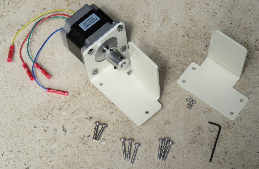 Replaces the manual crank and mounting brackets used in a wand style Coolaroo outdoor shade screen. The worm drive supplied with the Coolaroo shade is attached to the step motor through a flex coupling. Step motor connects to the Controller Assembly with 4 conductor low voltage cable (not included). Designed to mount to the inside surface of a wood support beam but can also be mounted to masonry surfaces. Works with Coolaroo shades 4, 6, 8 and 10ft wide and 10 ft high.